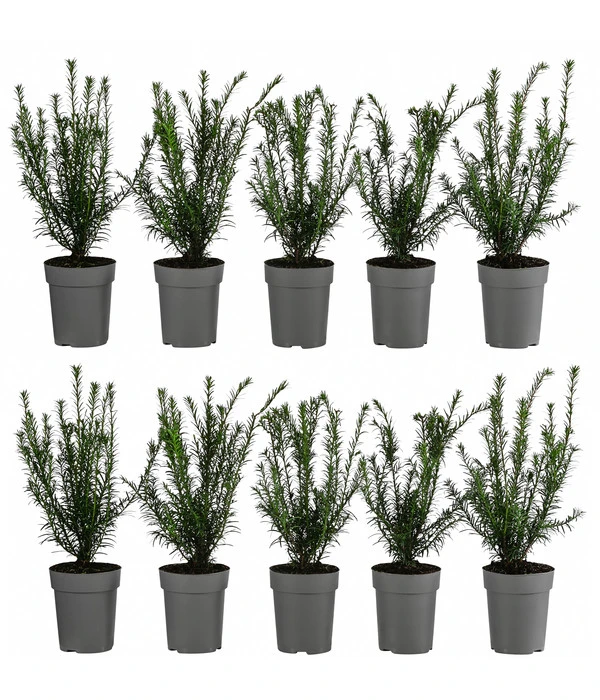Heutzutage sind Eiben in der Natur nur noch selten zu finden, anders als in der Frühzeit, als ihr hartes und zugleich elastisches Holz sehr beliebt für Bögen und anderes Werkzeug war und sie in vielen Wäldern das dichte Unterholz bildeten. Mit ihren erstaunlich weichen, wunderschön dunkelgrünen Nadeln und dem aufrechten, buschigen Wuchs sind Eiben seit jeher aber auch beliebte Ziergehölze in den herrschaftlichen Gärten und Parkanlagen. Mal recken sie sich als stolze Solisten in die Höhe, mal lenken sie die Blicke als in Form geschnittene Gehölze auf sich und mal bauen sie im Team mit vielen Kollegen eine blickdichte, auch im Winter grüne Hecke um Grundstücke und Sitzplätze. Sie sind gerade auf der Suche nach einer dekorativen und zugleich robusten und pflegeleichten Heckenpflanze? Dann nehmen Sie die 2-3 Meter Europäische Eibe, die wir Ihnen als praktischen 10er-Pack anbieten.