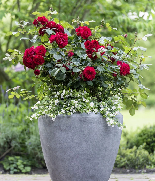Auch Balkon- und Terrassengärtner müssen auf den Charme der Beetrose ‚Montana®‘ nicht verzichten. Besonders geeignet sind die hohen Pflanztöpfe in Vasenform, in denen die Rose Platz für ihre langen Wurzeln findet. Wichtig ist außerdem ein guter Frostschutz für den Kübel, damit die Beetrose ‚Montana®‘ gut über den Winter kommt und sich auch im nächsten Jahr wieder im Schmuck ihrer herrlichen Blüten bewundern lassen kann.