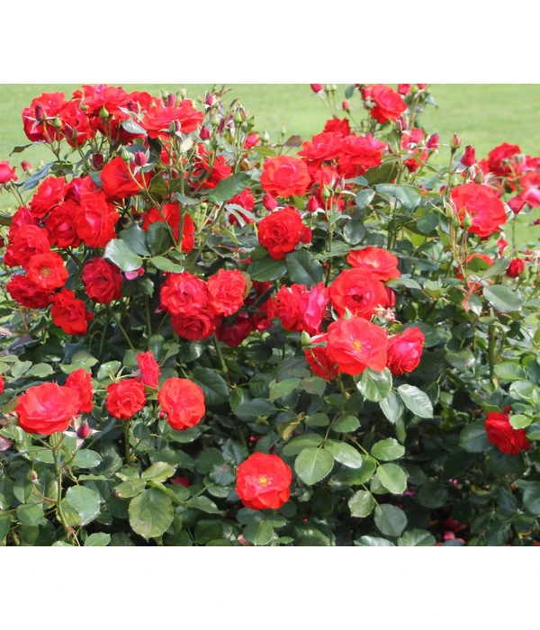 Manchmal brüstet sich jemand, die Nr. 1 bei diesem oder jenem zu sein. Die Beetrose ‚Montana®‘ hat es gar nicht nötig, sich selbst zu loben. Sie blüht einfach ohne Unterlass von Juni bis September in einer solchen Pracht, dass sich ihr Ruf fast von alleine verbreitet hat. Mit ihren wetterfesten, halbgefüllten Blüten, die in großen Dolden wachsen und in einem besonders intensiven Rot leuchten, hat die Beetrose ‚Montana®‘ inzwischen Fans auf der ganzen Welt. Die mittelhohe Rose erreicht eine Wuchshöhe von 50-80 cm und das Laub ist glänzend dunkelgrün. Neben der ungebremsten Blühstärke wissen Gärtner auch die Robustheit und gute Blattgesundheit der Rose zu schätzen, so dass sie nicht nur in Privatgärten, sondern sogar in öffentlichen Parkanlagen zu bewundern ist. Besonders beeindruckend ist die Wirkung, wenn nicht eine einzige Pflanze, sondern mehrere zu einer Gruppe zusammengesetzt werden und leuchtend rote Blüteninseln bilden. Bei Gruppenpflanzung empfiehlt sich ein Pflanzabstand von ca. 40-45 cm.
