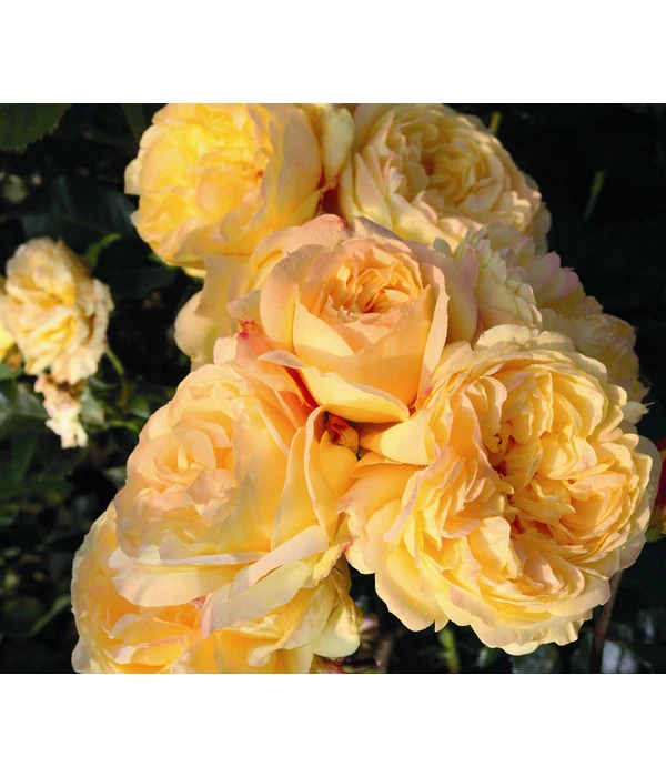 Bei uns in Rain am Lech getauft, verkörpert diese neue Beetrose mit nostalgischem Charme die Schönheit und Vielfalt der Landschaft entlang der Romantischen Straße und trägt ihren Namen daher zu Recht. Die Rose ‚Romantische Straße®‘ wächst kräftig verzweigt und wird 60 bis 90 cm groß. Sie bildet zahlreiche Blütendolden mit je drei bis fünf, stark gefüllten Blüten in einem hellen Gelbton. Die Knospen und später auch die Ränder der Blütenblatt-Außenseiten sind rot geflammt und die Blüten sind im Verblühen zart rosa. Dadurch bieten die Pflanzen ein wunderbares Farbspiel im sommerlichen Beet. Das dunkelgrüne, glänzende Laub ist besonders unempfindlich für die typischen Rosen-Blattkrankheiten wie Ruß- oder Mehltau. Diese sehr gelungene Rosenzüchtung stammt vom norddeutschen Rosenzüchter Tantau und wird auch von dort direkt verschickt.