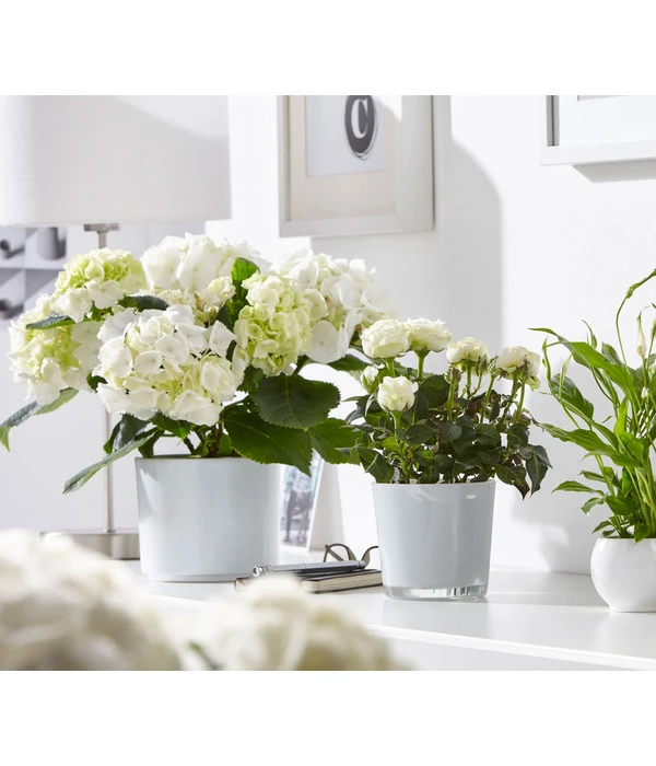 Mit diesem kleinen Übertopf aus Glas werten Sie mit wenigen Handgriffen Ihre Zimmerpflanzen und jedes Wohnambiente gekonnt auf. Ob auf einer Blumentreppe, auf der Fensterbank, auf einer Kommode, mal einzeln oder mal als Gruppe – mit diesem Glasübertopf kreieren Sie Ihre Wohnräume wunderbar harmonisch. Mit kleinen, blühenden Pflanzen wie Kalanchoe oder Rosen zusammen in diesem Übertopf aus Glas haben Sie eine langhaltende Tischdekoration. Sie bevorzugen den natürlichen Landhausstil oder nostalgischem Shabby-Chic, dann wählen Sie den Übertopf aus Glas am besten in den Farben Weiß und Rosa. Zu einem puristisch modernen Ambiente passen die Glastöpfe in Grau oder Braun. Die verschiedenen aufeinander abgestimmten Farbtöne lassen sich für ein effektvolles Farbenspiel perfekt miteinander kombinieren und fügen sich in jede Umgebung passend ein.