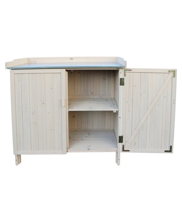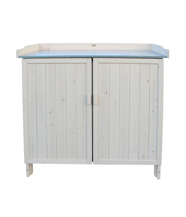 Der Gartentisch Lino bietet gleich mehrere positive Eigenschaften. Er eignet sich zunächst perfekt als Ablage, beispielsweise bei der Gartenparty, wenn Platten mit Fleisch nahe am Grill abgestellt werden müssen. Auch Werkzeuge oder andere Utensilien verschiedener Art finden auf dem Tisch schnell einen Platz. Weiterhin dient er Ihnen bei der Gartenarbeit als Pflanztisch. Stellen Sie Kübel oder Vasen ab, pflanzen Sie Ihre Keimlinge um, bewässern Sie diese oder fügen Sie Blumenerde hinzu. Alles lässt sich auf dem Tisch wunderbar durchführen. Seine Arbeitshöhe von 90 cm eignet sich dabei hervorragend für genannte Arbeiten und schont Ihren Rücken, da lästiges Bücken nicht notwendig wird. Nicht zuletzt punktet der Gartentisch Lino mit reichlich Stauraum im Lagerschrank unter der Arbeitsplatte aus lackiertem Metall. Hier können Sie alle Dinge verwahren, die Sie gerade nicht zum Arbeiten benötigen. Da es sich um ein wetterfestes Möbelstück für den Garten handelt, kann er bei Wind und Wetter draußen stehen.