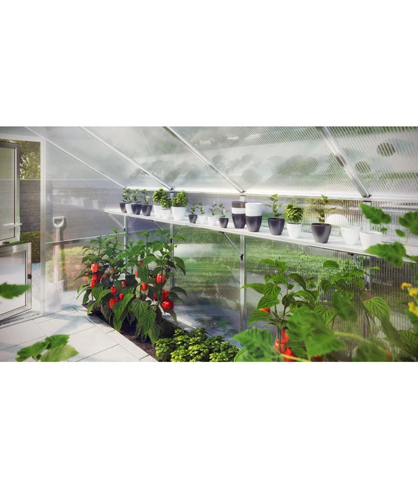 In ein hochwertiges Gewächshaus gehören hochqualitative Zubehörteile. Wenn Sie in Ihrem KGT Gewächshaus also mehr Stellfläche benötigen, hält KGT dieses passende stabile Hängebord für Sie bereit. Es ist genau auf die Bauweise der Gewächshäuser abgestimmt und kann einfach angebracht werden. Seine Konstruktion besteht aus einem robusten Aluminiumrahmen. Als Stellfläche fungieren genau angepasste Kunststoffplatten. Die Länge ist je nach Gewächshaus auszuwählen. In der Tiefe stehen Ihnen ganze 26 cm als Stellfläche zur Verfügung. Der Griff zu diesem Hängebord ist mehr als schlau, denn damit haben Sie es nicht nur beim Einbau leicht, sondern es nutzt den vorhandenen Platz optimal aus. Sie brauchen nicht zu stückeln, zu rechnen oder sich mit einer Kompromisslösung zufrieden zu geben.