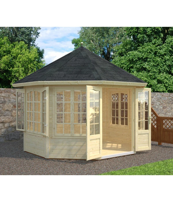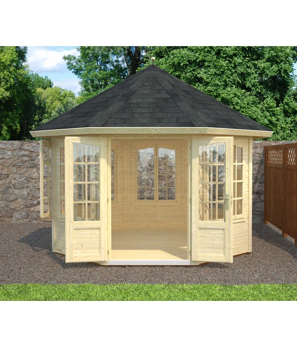 Das Besondere am Palmako Pavillon Veronica 6 ist seine ausgewogene, symmetrische, achteckige Form in stabiler Bauweise. Sieben seiner Wände sind mit großen Sprossenfenstern versehen, die achte Wand bietet Einlass durch eine 120 cm breite Doppelflügeltür, ebenfalls mit aufgesetzten Sprossen. Fenster und Türen sind aus gehärtetem Doppelglas und lassen sich nach außen öffnen. Die Tür wurde aus einem Leimholz gefertigt und ist mit einer hochwertigen Drückergarnitur und einem Zylinderschloss ausgestattet, die niedrige Türschwelle hat eine Edelstahlabdeckung. Der Palmako Pavillon Veronica 6 besteht aus naturbelassenen, 34 mm starken Bohlen aus erstklassiger Nordischer Fichte. Spezielle Eckverbindungen (Chaletschnitt) für wind- und regendichte Ecken, imprägnierte Fundamentbalken und Sturmleisten für eine perfekte Wind- und Sturmsicherung sind weitere Qualitätskriterien. Im Bausatz enthalten sind außerdem 19 mm starke Massivholzbodenbretter und 16 mm starke Dachbretter mit Nut und Feder, allerdings keine Schindeln für die Eindeckung. Wir empfehlen, die passenden Palmako Dachschindeln gleich mitzubestellen.