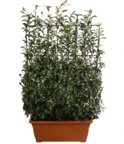 Wie Sie sicherlich bereits gesehen haben, bieten wir Ihnen die Purpur-Glanzmispel ‚Glanzkopf‘ in einem rechteckigen Kübel mit einem Fassungsvermögen von 35 l an. Und weil die Pflanze in der Baumschule bereits an das Wachsen an einem Spalier gewöhnt wurde, haben Sie einen fertigen Sichtschutz, der aus Ihrer Terrasse oder dem Balkon schnell eine blickdichte, private Oase macht.