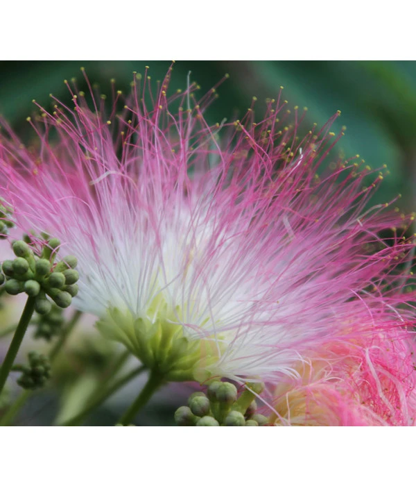 Sehen sie nicht aus wie die seidigen Fäden einer Puderquaste, die den Teint einer schönen Frau noch zarter erscheinen lässt? Die Blütenbüschel dieses Ziergehölzes strahlen eine faszinierende Exotik aus, so dass der Seidenbaum ‘Ombrella‘ sofort zum viel bewunderten Blickfang im Garten wird. Vor allem, wenn er sich zwischen Juli und September im Schmuck seiner prächtigen, rosafarbenen Blüten präsentiert. Aber auch sonst ist die Seidenakazie kein Mauerblümchen. Der Baum hat dunkelgrüne, doppelt gefiederte Blätter, die Sie unbedingt am Abend beobachten sollten. Denn dann werden Sie überrascht feststellen, dass sich die Blätter nachts einrollen – schlafen gehen – was der Seidenakazie auch den Beinamen Schlafbaum gegeben hat. Dieses interessante Schauspiel können Sie auch in Trockenzeiten beobachten. Mit einem Jahreszuwachs von 20 – 40 cm pro Jahr gehört der sommergrüne Seidenbaum ‘Ombrella‘ zu den schnell wachsenden Gehölzen, allerdings beendet er sein Größenwachstum bei einer Höhe von 6 – 8 m. Die außergewöhnlichen Blüten, der filigrane Blattschmuck in Zusammenspiel mit der prächtigen, schirmartigen Krone machen die Seidenakazie ‘Ombrella‘ zu einem der schönsten Ziergehölze für Gärten und Parks.