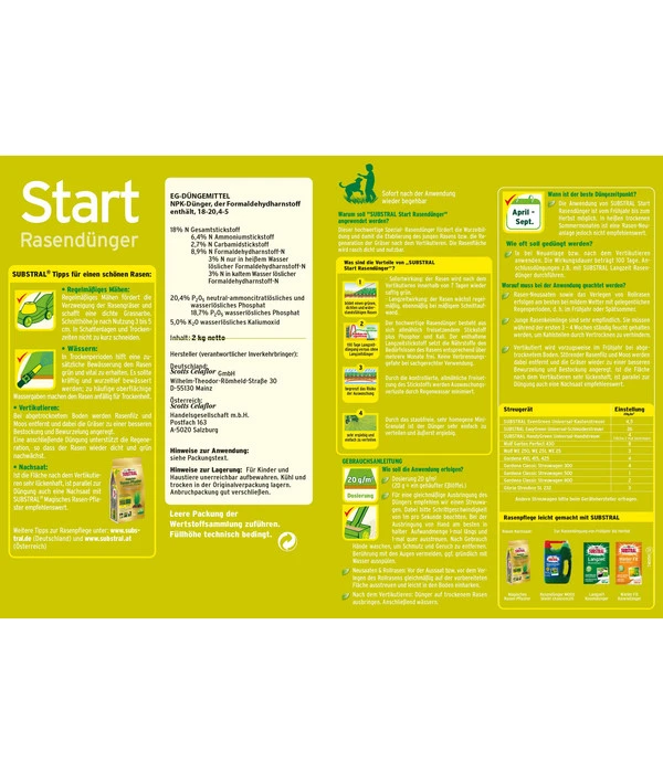 Gärtnern ist ein wundervolles Hobby, bei dem Ihr liebster Teilbereich, der Rasen, noch einmal deutlich heraussticht. Diese im Idealfall frische, saftige Grünfläche, die an einen herrlichen Hochflorteppich erinnert, gehört zu den Königsdisziplinen im Garten. Schlaue Hilfsmittel wie der Substral® Start Rasendünger können dabei entscheidend für Ihren Erfolg bei der Rasenanlage und –pflege sein. Dieser hochwertige Spezialrasendünger eignet sich sowohl zum Etablieren als auch zum Regenerieren Ihrer geliebten Grünfläche, denn er kann bei Rollrasen genauso wie zur Neuaussaat oder auch nach dem Vertikutieren zur Anwendung kommen. Der Dünger ist mit seiner NPK-Mischung (Stickstoff, Phosphat und Kalium) plus Formaldehyd-Harnstoff individuell auf die Bedürfnisse von Rasenpflanzen abgestimmt. Als besonders phosphatreiches Produkt fördert er ganz bewusst eine schnelle Wurzelbildung, sorgt für kräftige Pflänzchen und macht den Rasen für Sie schnell nutzbar. Lassen Sie sich also von Substral® Start Rasendünger bei der erfolgreichen Rasenarbeit unterstützen und genießen Sie schon bald die bewundernden Blicke von Freunden und Nachbarn!