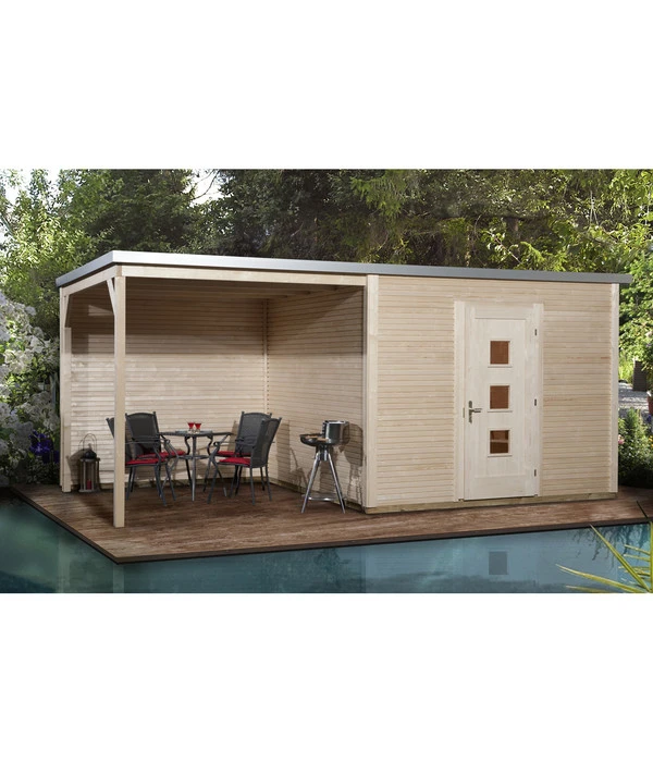 Überdachter Sitzplatz und praktischer Stauraum unter einem Dach. Das Weka Designhaus wekaLine 413 B macht sich doppelt nützlich