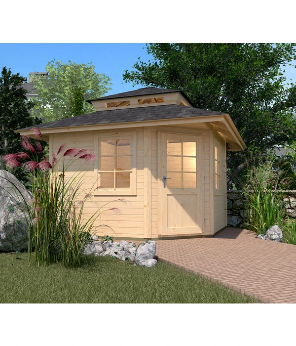 Gr. 2, stabile Blockbohlen, 5-eckige Form, Walmdach mit Fenstern