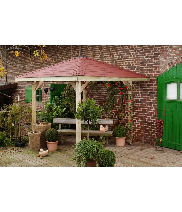 4-Eck Gartenoase 651 mit naturbelassenem 19 mm Massivholzdach, ohne Boden, Konstruktionshölzer kesseldruckimprägniert