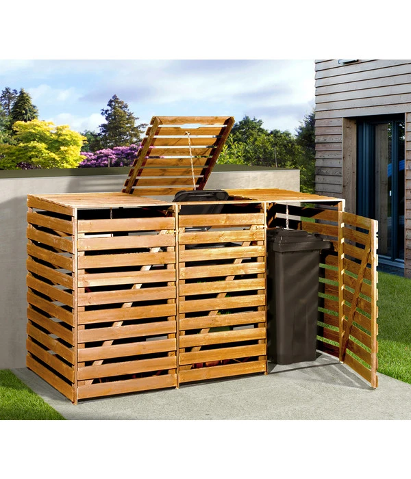 Sie wollen gerade nach einem harten Arbeitstag gemütlich im Garten die Füße hochlegen, lassen Ihren Blick schweifen – und bleiben an den wenig ansprechenden Mülltonnen in Ihrer Einfahrt hängen. Das muss nicht sein. Schaffen Sie Ordnung in Ihrer Hofeinfahrt! Bis zu drei störende Mülltonnen verschwinden stilvoll hinter den naturbelassenen Kiefernholzbrettern der eleganten Weka Mülltonnenbox. Diese fügt sich dank der natürlichen Holzoptik ästhetisch in Hof und Garten ein. Ein besonders harmonisches Gesamtbild ergibt sich bei einer Begrünung mit Rankpflanzen oder Blumenkübeln. So zaubern Sie aus einer ehemals tristen, ausschließlich zweckmäßigen Ecke ein neues aufregendes Detail in Ihrem Gartenreich.