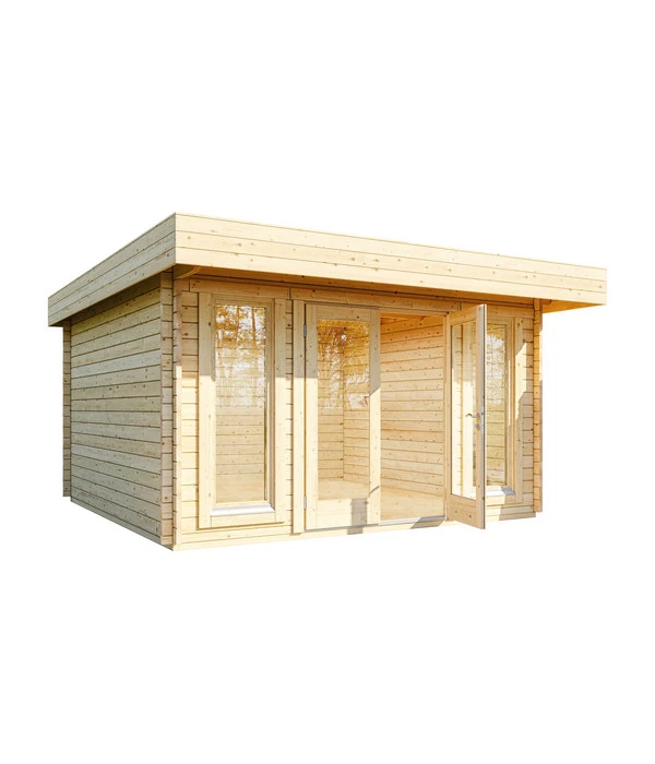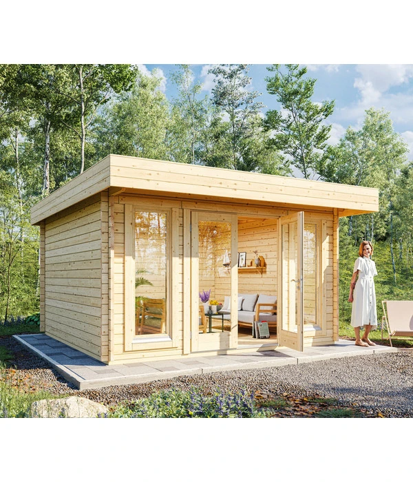 Die Wände bestehen beim Wolff Finnhaus Gartenhaus Malmö 44-A aus 44 mm starken Holzbohlen, der Fußboden hat eine Stärke von 28 mm. Auch das Dach lässt keine Wünsche offen, denn die Dachpfetten sind sehr stabil und können zum Beispiel eine Schneelast von 180 kg tragen. Die Dachbretter sind 20 mm stark und im Lieferumfang ist auch die Bitumen-Dachpappe zur Ersteindeckung enthalten. Betreten können Sie das Haus durch die großzügige Doppeltür aus bestem Leimholz, deren Glasflächen natürlich aus Isolierglas bestehen. Auch die beiden bodentiefen Fenster sind isolierverglast und können geöffnet werden. Wir empfehlen Ihnen, das naturbelassene Holz mit einer Holzschutzlasur zu behandeln, damit es wetterunempfindlicher wird. Ob das Wolff Finnhaus Gartenhaus Malmö 44-A dann weiterhin seinen Naturfarbton zeigt oder ob Sie es nordischen Rot oder frischem Blau anstreichen, ist ganz Ihrem persönlichen Geschmack überlassen.