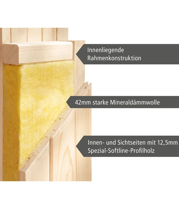 Die Wolff Finnhaus Innensauna de luxe Despina ist mit einer bronzierten Ganzglastür aus Einscheibensicherheitsglas ausgestattet, die den Blick freigibt auf die zwei klassischen Bänke aus hochwertigem Espenholz. Während des Saunagangs wird auch das angenehme Licht zu der besonderen Wohlfühl-Atmosphäre beitragen, denn zum Dachkranz gehört ein LED-Strahlerset mit 3 frei positionierbaren 7,5 Watt-Strahlern. Die vormontierten Wände mit einer Stärke von 68 mm bestehen aus Nordischer Fichte inklusive einer zusätzlichen Dämmung mit Mineralwolle; auch die vormontierte Decke ist mit Mineralwolle gedämmt, damit die Wärme dort bleibt, wo sie hingehört: in die Wolff Finnhaus Innensauna de luxe Despina.